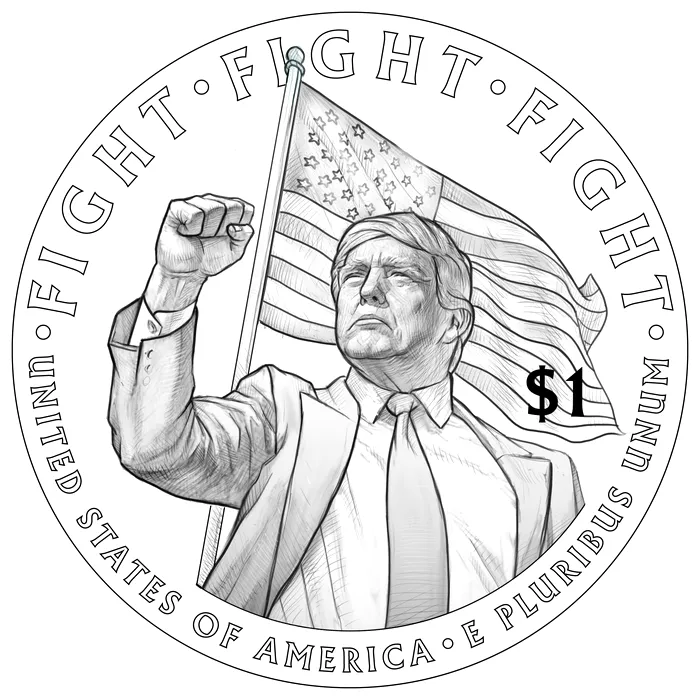 Moneda, care ar marca 250 de ani de la Declarația de Independență a SUA, are pe avers imaginea lui Trump în profil, iar pe revers acesta ridică pumnul în semn de sfidare, însoțit de cuvintele „luptă, luptă, luptă”, un slogan simbolic care a apărut după tentativa de asasinare a președintelui în 2024.