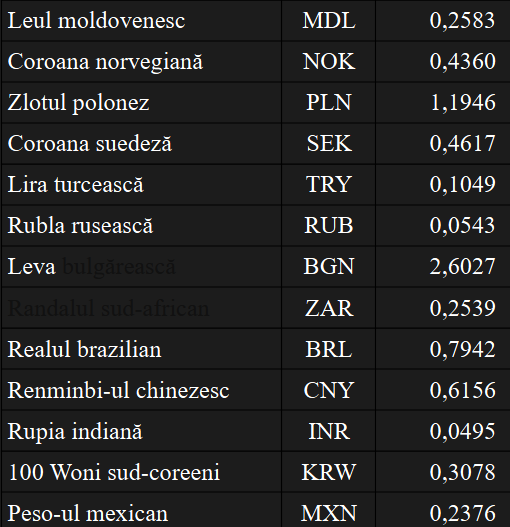 Moneda europeană a mai scăzut puțin, fiind cotată de BNR la 5,0903 lei. Dolarul american s-a depreciat până la 4,3905 lei, iar francul elvețian și lira sterlină au fost evaluate în creștere, la 5,4664 lei, respectiv 5,8560 lei.