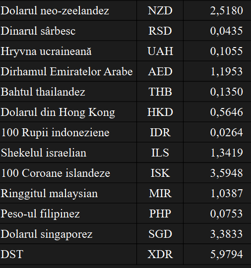 Cursurile pieţei valutare sunt calculate de BNR pe baza cotaţiilor practicate de societăţile bancare autorizate să efectueze operaţiuni pe piaţa valutară. Lista nu implică obligativitatea utilizării cursurilor valutelor și aurului în tranzacții efective de schimb valutar și înregistrări contabile, a precizat BNR.