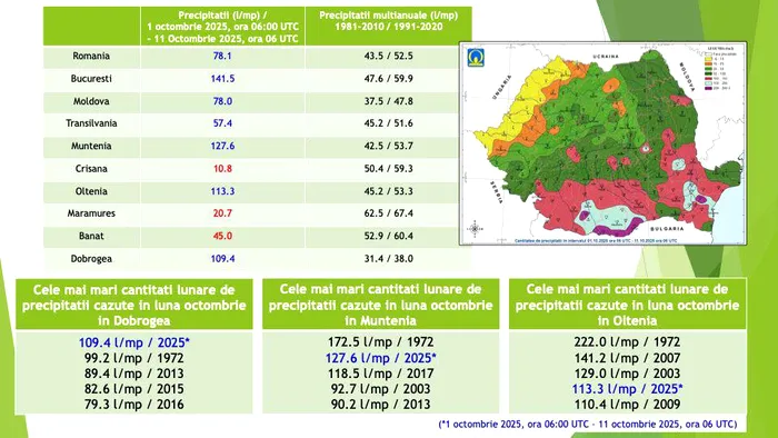 Potrivit datelor publicate de Administrația Națională de Meteorologie (ANM), primele zece zile din luna octombrie 2025 au adus cantități de precipitații record în sudul și sud-estul țării, în unele locuri depășindu-se chiar și cu 70 de ani vechile maxime istorice.