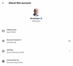 Conform Gândul, jurnalistul Patrick André de Hillerin a scris pe Facebook că „X a început să afișeze țara în care este atribuit fiecare cont. Prostălăul sau prostălăii care lucrează pentru Ilie Bolojan, premierul României, au făcut în așa fel încât contul de X al lui Bolojan apare ca fiind bazat în Hong Kong.”