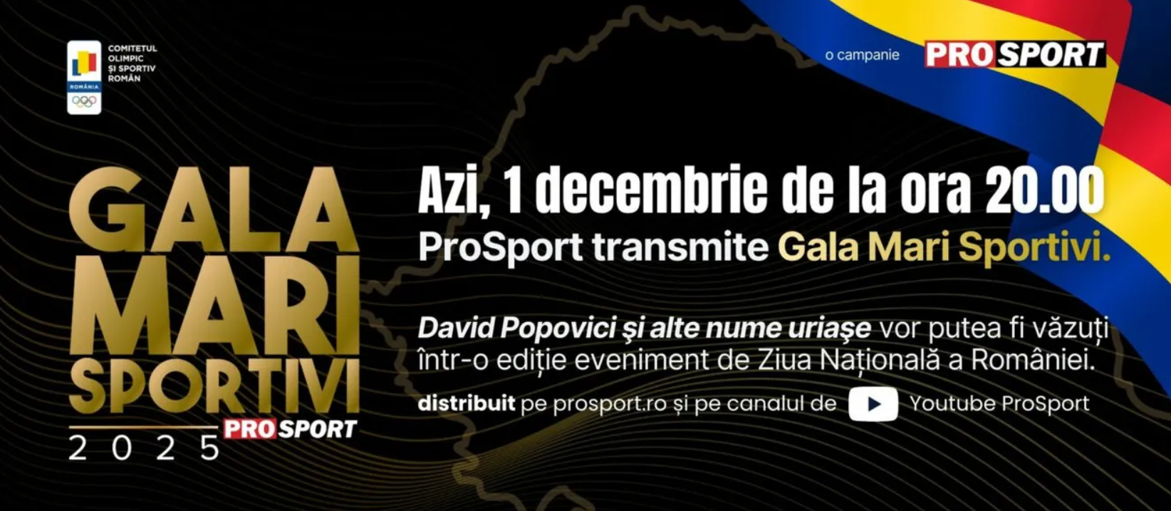 ProSport a organizat, ca în fiecare an, Gala Mari Sportivi, eveniment menit să le aducă o recunoaștere suplimentară celor care au reușit să ducă numele țării noastre pe cele mai înalte culmi ale succesului. Acesta este motivul pentru care azi, 1 Decembrie, de Ziua Națională a României, evenimentul va fi transmis, începând cu ora 20:00, pe canalul de YouTube ProSport și pe Facebook ProSport.