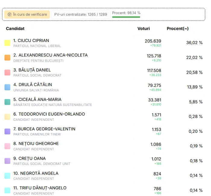 Rezultatele alegerilor pentru Primăria Generală a Capitalei arată că noul edil este Ciprian Ciucu, candidatul PNL. Mai sunt de numărat aproximativ 25.000 de voturi la momentul redactării știrii.