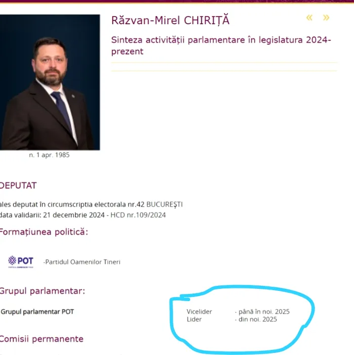 În data de 5 noiembrie, Anamaria Gavrilă anunţa că îl desemnează ”cu bucurie şi încredere” pe Răzvan Mirel Chiriţă în funcţia de lider al grupului parlamentar POT din Camera Deputaţilor.