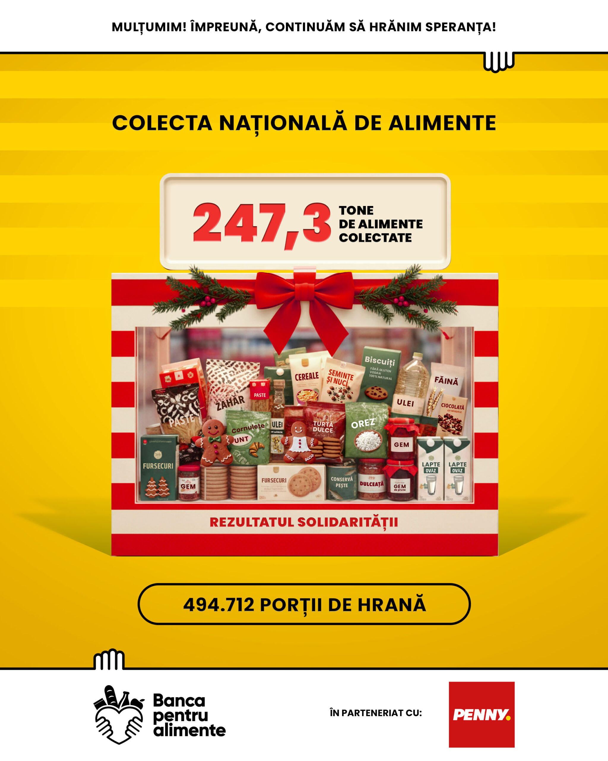 Campania s-a desfășurat în cele 441 magazine PENNY din toată țara și a reunit 4.405 voluntari, care au încurajat donațiile și au ajutat la colectarea produselor neperisabile – un gest simplu, dar cu impact major. Cu sprijinul clienților și al voluntarilor dedicați, au fost colectate 247.356,4 kg de alimente, care au ajuns la 40.826 persoane aflate în nevoie, prin intermediul a 254 de organizații partenere beneficiare.