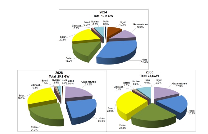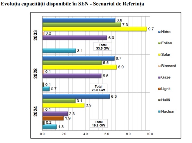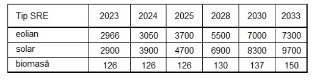 „Astfel, în perioada 2024-2033, sursele regenerabile vor înregistra o creștere totală de capacitate de aproximativ 11,6 GW (din care peste 11,1 GW eolian + solar), capacitatea totală SRE instalată în SEN in 2033 urmând să depășească 23,7 GW (inclusiv hidro)”, se arată în raportul ANRE.