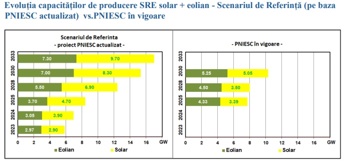 Astfel, conform noilor ținte prevăzute în proiectul de actualizare a Planului Integrat în Domeniul Energiei și Schimbărilor Climatice (PNIESC), se prevede o majorare cu aproximativ 5 GW a capacității totale solară și eoliană pentru anul 2030, față de valorile asumate în versiunea actuală.