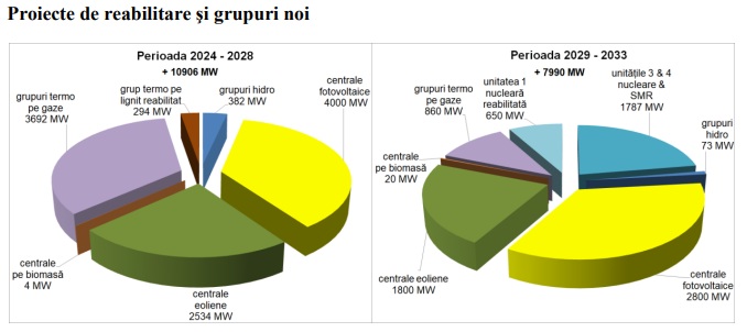 Proiectele de reabilitare şi grupurile noi ce vor fi puse în funcțiune în Scenariul de Referință, în perioadele relevante, agregate pe categorii de centrale în funcție de combustibilul principal, înseamnă o creștere de 10.906 MW în perioada 2024 – 2028 și și de 7.990 MW în anii 2029 – 2033.