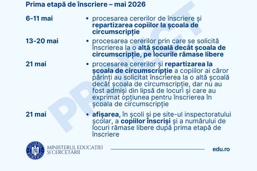 Proiectul prevede și o perioadă de siguranță între 1 și 4 septembrie 2026, destinată soluționării de către inspectoratele școlare a cererilor pentru copiii care nu au fost încă înscriși sau a oricăror alte situații speciale.