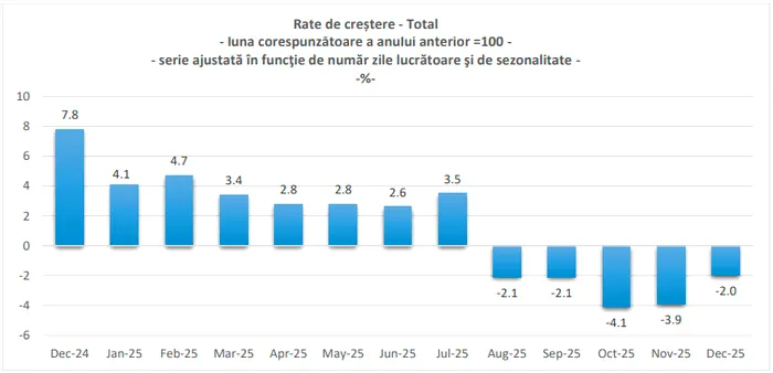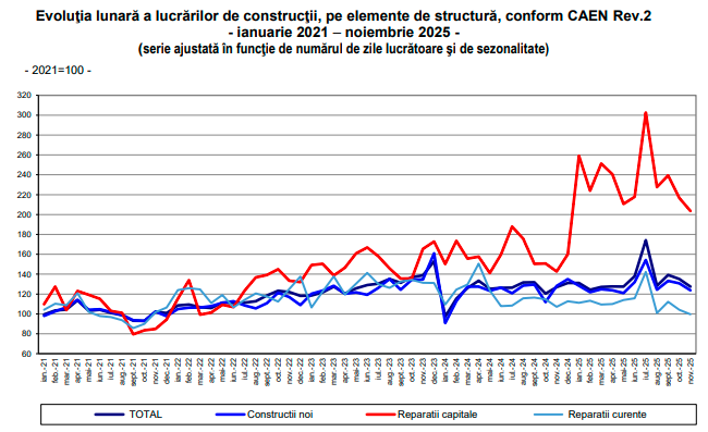 Construcții și investiții. Sectorul construcțiilor a avut o evoluție atipică: un boom pe parcursul lui 2025, urmat de o frânare bruscă spre sfârșit de an. În noiembrie, volumul lucrărilor de construcții a scăzut cu 5,8% față de octombrie (ajustat sezonier), o contracție însemnată pentru o singură lună. Rata anuală abia a rămas pozitivă (+0,4% față de noiembrie 2024, după ce anterior fusese mai mare de 13% în octombrie). Practic, motorul construcțiilor a început să se gripeze, semnalând că și componenta de formare brută de capital (investițiile) a încetinit accelerat la final de an. Reducerea puternică a dinamicii creditului neguvernamental în T4 2025 validează că firmele au blocat / amânat planurile de investiții și evită împrumuturile, pe fondul dobânzilor ridicate și perspectivelor economice sumbre.