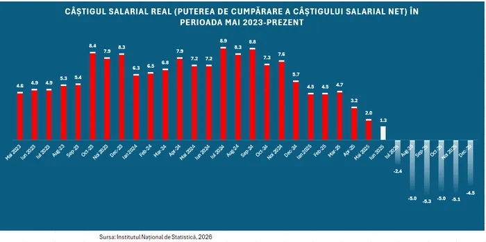 Datele Institutului Național de Statistică indică scăderi puternice în perioada mai 2025-decembrie 2025: 6,5% la salariații din Sănătate și asistență socială, minus 10,1% în sectorul Administrație Publică și Apărare și un record de minus 12,5% în Învățământ. Puterea de cumpărare a pensiilor și prestațiilor sociale s-a prăbușit în ultimele luni ale anului trecut, evidențiind cea mai mare prăbușire din ultimii 25 de ani. Scăderile masive ale puterii de cumpărare validează difuzia recesiunii în economie.