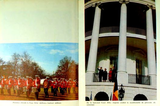 Limuzina se opreşte la intrarea din sud a Casei Albe, bogat ornamentată. Aici, cu cîteva momente înainte, au sosit preşedintele Richard Nixon doamna Patricia Nixon. La coborîrea oaspeților din limuzină, preşedintele S.U.A. îl salută cu căldură pe preşedintele Nicolae Ceauşescu, urîndu-i bun venit. Preşedintele Consiliului de Stat al României îşi exprimă satisfacţia de a-l întîlni din nou pe preşedintele american. La rîndul ei, doamna Patricia Nixon salută cu cordialitate pe tovarăşa Elena Ceauşescu.