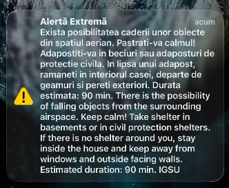 Potrivit comunicatului transmis de ISU Tulcea, mesajul RO-Alert a fost trimis prin sistemul național de avertizare la solicitarea autorităților competente în monitorizarea spațiului aerian, în baza informărilor primite de la Statul Major al Forțelor Aeriene.