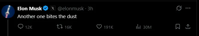 Miliardarul a scris pe platforma X „Another one bites the dust” (De încă unul se alege praful N.R.)
