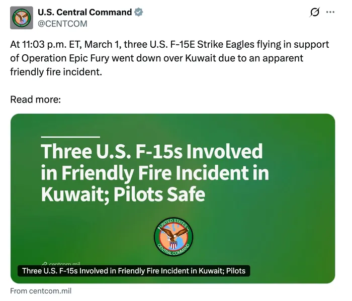 CENTCOM afirmă că 3 avioane de vânătoare americane F-15E au fost doborâte deasupra Kuweitului într-un incident aparent de „friendly fire” în timpul operațiunilor de luptă active