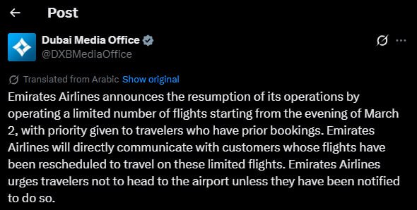 „Emirates Airlines anunță reluarea operațiunilor sale prin operarea unui număr limitat de zboruri începând cu seara zilei de 2 martie, cu prioritate acordată călătorilor care au rezervări prealabile”