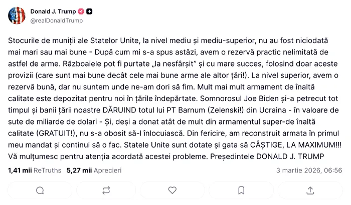 „Stocurile de muniții ale Statelor Unite, la nivel mediu și mediu-superior, nu au fost niciodată mai mari sau mai bune – După cum mi s-a spus astăzi, avem o rezervă practic nelimitată de astfel de arme.