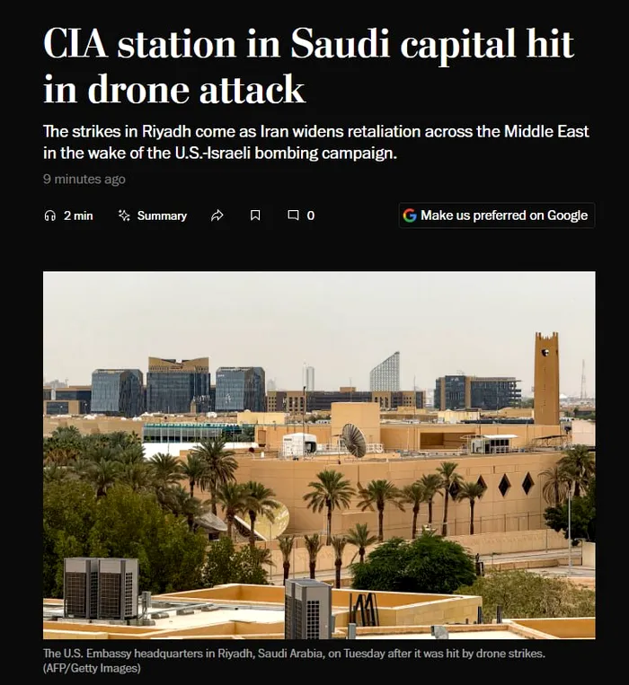 Chiar în seara în care o altă dronă iraniană a lovit consulatul SUA din Dubai, care este cuprins de flăcări, Washington Post dezvăluie că, luni, dronele iraniene au lovit stația CIA de la Ambasada SUA din Arabia Saudită.