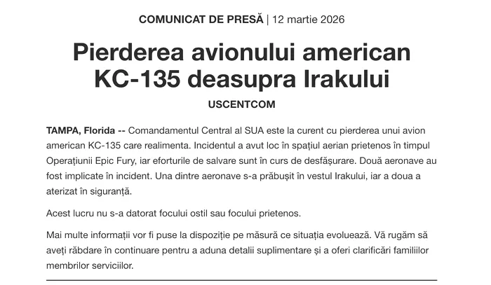Un comunicat de ultimă oră al Comandamentului Central al Armatei SUA din Tampa, Florida, anunță că un avion american KC-135, care se afla în timpul realimentării, a fost pierdut în spațiul aerian prietenos în timpul Operațiunii Epic Fury