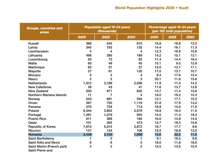 Documentul ONU arată că în 2020, România avea doar 3,4 milioane de tineri cu vârste cuprinse între 15 și 24 de ani, însemnând 15,6% din total populație.