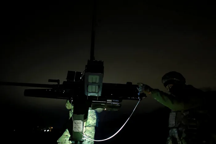 A soldier from a mobile unit of the Tsunami Regiment of the Liut Brigade of Ukraine?s National Police uses an M2 Browning machine gun to shoot down Russian drones in the Odesa district, Ukraine, December 22, 2025. Photo by Nina Liashonok/Ukrinform/ABACAPRESS.COM