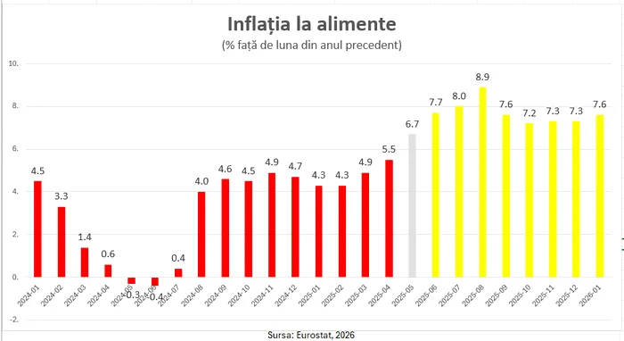 Evoluția lunară indică o accelerare a inflației alimentare: de la valori de 5–6% în prima parte a anului 2025, creșterile au ajuns la aproape 9% în a doua jumătate a anului, niveluri care se mențin ridicate și în prezent.