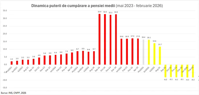 În paralel, datele privind dinamica puterii de cumpărare a pensiei medii indică o deteriorare rapidă. După o perioadă de creșteri nominale în 2024, efectul acestora a fost anulat de inflație.